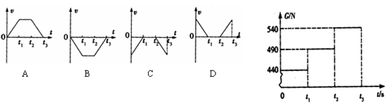 1、选择题 某同学在地面上用弹簧秤称得其体重为490N,他将弹簧秤移至电梯内称其体重,t=0时刻电梯开始运行,0至t3时间段内,弹簧秤的示数如图所示,电梯运行的v-t图可能是(取电梯向上运动的方向为正)(?)?