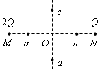 4、选择题 如图所示,正点电荷2Q、Q分别置于M、N两点,O点为MN连线的中点。点a、b在MN连线上,点c、d在MN中垂线上,它们都关于O点对称。下列说法正确的是