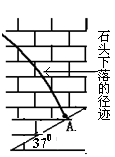 2、计算题 某同学在某砖墙前的高处水平抛出一石子,石子在空中运动的部分轨迹照片如图所示。从照片可看出石子恰好垂直打在一倾角为370的斜坡上的A点。已知每块砖的平均厚度为20cm,抛出点到A点竖直方向刚好相距100块砖,求:(1)石子在空中运动的时间t;(2)石子水平抛出的速度v0。(已知sin370=0.6;cos370=0.8)