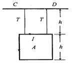 如图所示,一边长为h的正方形线圈A,其中电流I大小和方向均保持不变,用两条长度恒为h的绝缘细绳静止悬挂于水平长直导线CD的正下方。当导线CD中无电流时,两细绳中张力均为T;当通过CD的电流为i时,两细绳中张力均降到