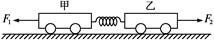 2、选择题 如图所示,甲、乙两小车的质量分别为m1、m2,且m1>m2,用轻弹簧将两小车连接,静止在光滑的水平面上.现在同时对甲、乙两车施加等大反向的水平恒力F1、F2,使甲、乙两车同时由静止开始运动,直到弹簧被拉到最长(弹簧仍在弹性限度内)的过程中,对甲、乙两小车及弹簧组成的系统,下列说法正确的是? ( )
