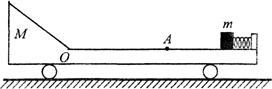 5、计算题 如图10所示,光滑水平面上有一长板车,车的上表面OA段是一长为L的水平粗糙轨道,A的右侧光滑,水平轨道左侧是一光滑斜面轨道,斜面轨道与水平轨道在O点平滑连接.车右端固定一个处于锁定状态的压缩轻弹簧,其弹性势能为Ep,一质量为m的小物体(可视为质点)紧靠弹簧,小物体与粗糙水平轨道间的动摩擦因数为μ,整个装置处于静止状态.现将轻弹簧解除锁定,小物体被弹出后滑上水平粗糙轨道.车的质量为 2m,斜面轨道的长度足够长,忽略小物体运动经过O点处产生的机械能损失,不计空气阻力.求: