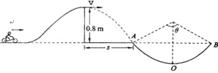 1、计算题 如图所示,摩托车做腾跃特技表演,沿曲面冲上高0.8m顶部水平高台,接着以v=3m/s水平速度离开平台,落至地面时,恰能无碰撞地沿圆弧切线从A点切入光滑竖直圆弧轨道,并沿轨道下滑。A、B为圆弧两端点,其连线水平。已知圆弧半径为R=1.0m,人和车的总质量为180kg,特技表演的全过程中,阻力忽略不计。(计算中取g=10m/s2,sin53°=0.8,cos53°=0.6)。求: