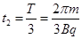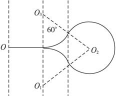可见在两磁场区粒子运动半径相同,如图所示,三段圆弧的圆心组成的三角形△O1O2O3是等边三角形,其边长为2R。所以中间磁场区域的宽度为。