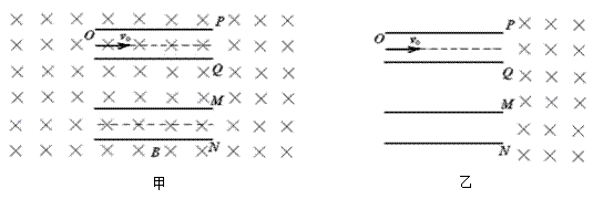 2、计算题 如图18甲所示,两个几何形状完全相同的平行板电容器PQ和MN,水平置于水平方向的匀强磁场中(磁场区域足够大),两电容器极板的左端和右端分别在同一竖直线上,已知P、Q之间和M、N之间的距离都是d,极板本身的厚度不计,板间电压都是U,两电容器的极板长相等。今有一电子从极板PQ中轴线左边缘的O点,以速度v0沿其中轴线进入电容器,并做匀速直线运动,此后经过磁场偏转又沿水平方向进入到电容器MN之间,且沿MN的中轴线做匀速直线运动,再经过磁场偏转又通过O点沿水平方向进入电容器PQ之间,如此循环往复。已知电子质量为m,电荷量为e。不计电容之外的电场对电子运动的影响。