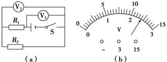 2、选择题 在图(a)所示电路中,V1、V2都是有0~3 V和0~15 V两个量程的电压表.当闭合开关后,两个电压表指针偏转均如图(b)所示,则电阻R1、R2两端的电压分别为( )