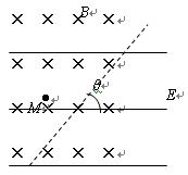 2、填空题 如图所示,地面附近的空间存在着足够大的水平匀强磁场(磁感应强度大小为B,方向见图)和与之垂直的水平匀强电场 (场强大小为E,方向未画出),一个带电质点在与磁场垂直的平面内沿直线斜向上运动(图中虚线),该直线与电场线所夹锐角为θ,设在运动过程中质点的电量和质量都不变,则该质点带______电,经过该直线上的M点时运动速度大小为___________。