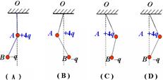 3、选择题 如图(a)所示,两段等长绝缘细线将质量分别为2m、m的小球A、B悬挂在O点,小球A、B分别带有+4q和-q电量,当系统处于水平向右的匀强电场中并静止时,可能出现的状态应是(? )
