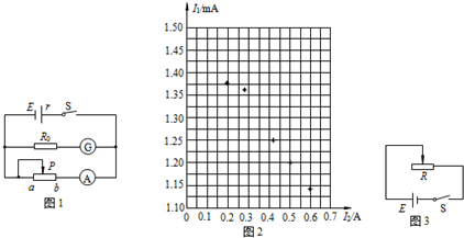 (1)一组同学设计的实验电路如图1所示,并利用以上器材正确连接好电路,进行了实验测量.根据他们的实验设计,完成下列问题:闭合开关S,移动滑动变阻器的滑动端P至某一位置,记录电流表G的示数I1和电流表A的示数I2.多次改变滑动端P的位置,得到多组数据.在图2所示的坐标纸上建立I1、I2坐标系,并已标出了与测量数据对应的5个坐标点.还有一组数据如图的电表所示,请依据所标各点标在图中描绘I1-I2图线.