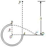 3、计算题 如图所示,竖直平面内的3/4圆弧形不光滑管道半径R=0.8m,A端与圆心O等高,AD为水平面,B点为管道的最高点且在O的正上方。一小球质量m=0.5kg,在A点正上方高h=2.0m处的P点由静止释放,自由下落至A点进入管道并通过B点,过B点时小球的速度vB为4m/s,小球最后落到AD面上的C点处。不计空气阻力。g=10m/s2。求: