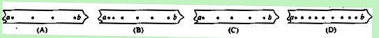4、选择题 如图所示为同一打点计时器在四条水平运动的纸带上打出的点,其中a , b间的平均速度最大的是哪一条?(?)