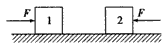 3、选择题 如图所示,两个物体1和2置于光滑的水平面上,它们的质量分别为m1和m2,且m1<m2,现将两个大小 均为F、方向相反的恒力同时作用在1和2上,经相同的距离后(两物体还没接触),撤去两个力,此后两物体碰撞并粘在一起,碰撞后,两物体将