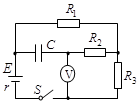 1、填空题 如图所示的电路中,电源电动势E=10V,内阻r=1Ω,电容器的电容C=40μF,电阻R1=R2=4Ω,R3=5Ω.接通电键S,待电路稳定后,则理想电压表V的读数U=?;电容器的带电量Q=?.(保留两位有效数字)