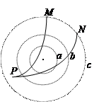 2、选择题  如图所示,虚线abc为三个同心原面,圆心处为一个点电荷。现从bc之间一点P以相同的速率发射两个电荷量、质量都相同的带电粒子,分别沿PMPN运动到MNMN两点都处于圆周c上,以下判断正确的是?