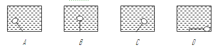 4、选择题 如图所示,一个密闭的容器中充满水,里面有一个用线系住的乒乓球,球的一端固定在容器的底部,容器静止时,线在竖直方向上,当容器向左做匀加速直线运动时,容器中乒乓球相对于容器静止后所在的位置是下图中的哪一个