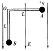1、填空题 如图所示,质量不计的直角形支架两端分别连接质量为m和2m的小球A和B,支架的两直角边长度均为L,可绕固定轴O在竖直平面内无摩擦转动,空气阻力不计。设A球带正电,电荷量为q,B球不带电,处在竖直向下的匀强电场中。开始时OA边处于水平位置,由静止释放,当杆O转过37°时,小球A的速度最大,则匀强电场的场强E的大小为___________;若在转动过程中杆OA所能转过的最大角度为θm,则cosθm=___________。(已知sin37°=0.6,cos37°=0.8)