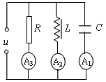 2、选择题 如图交流电流表A1、A2、A3分别与电容器C、线圈L和电阻R串联后接在同一交流电源上,供电电压瞬时值u1=Umsinω1t,三个电流表各有不同的读数。现换另一个电源供电,瞬时值为u2=Umsinω2t,ω2=2ω1。改换电源后,三个电流表的读数变化情况