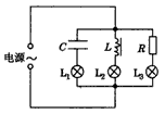 4、选择题 如图所示电路中,L1,L2,L3是三盏相同的电灯,当电源为220V的交流电源时,L1,L2,L3的发光情况相同。如将电源改为220 V的直流电源,则稳定后与前一种情况对比观察到的现象是?
