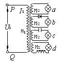 1、选择题 如图所示,一理想变压器,原线圈匝数为n1,四个副线圈的匝数均为n2。a、b、c、d是四个完全相同的灯泡,二极管(二极管具有单向导电性)、电容和电感线圈都视为理想元件。现从原线圈P、Q两点输入正弦交流电,那么下列说法正确的是:(? )