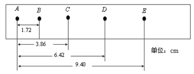 3、实验题 如图是研究匀变速直线运动时打点计时器打出的纸带,图中A、B、C、D、E是按时间顺序先后打出的记数点(电源频率为50Hz,每两个计数点间有4个点未画出),用刻度尺量出A点到各点之间的距离如图所示,那么小车的加速度大小是?m/s2,方向是?。(填“向左”或“向右”)B点速度的大小是?m/s? E点速度的大小是?m/s(结果保留两位有效数字)