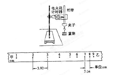 本题解析:电火花计时器的工作电压与频率分别为220v、50Hz,在自由落体运动过程中物体运动的速度均匀增大,纸带上点的间距会逐渐变大,纸带应于乙端相连接。由,可求加速度为9.40m/s2,在实验中受摩擦和空气阻力,加速度测量值会存在误差。