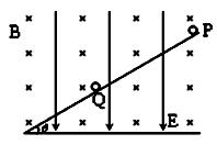 3、计算题 (21分)在倾角为30°的光滑斜面上有相距40m的两个可看作质点的小物体P和Q,质量分别mP=0.1kg和mQ=0.5kg,其中P不带电,Q带电。整个装置处在正交的匀强电场和匀强磁场中,电场强度的大小为50V/m,方向竖直向下;磁感应强度的大小为T,方向垂直纸面向里。开始时,将小物体P无初速释放,当P运动至Q处时,与静止在该处的小物体Q相碰,碰撞中Q的电荷量保持不变(即不转移)。碰撞后,两物体能够再次相遇。斜面无限长,g取10m/s2。求: