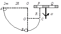 圆弧轨道BC相切于B点,两轨道置于竖直平面内,在C点的正上方有一厚度不计的旋转平台,沿平台的一条直径上开有两个小孔P、Q,两孔离轴心等距离,旋转时两孔均能到达C点正上方,平台离C点的高度为R,质量为2m的小球1自A点由静止开始下落,在B点与质量为m的2球作弹性碰撞,碰后2球过C点,且恰能无碰撞穿过小孔P.