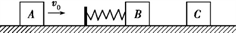 5、计算题  (9分)如图,光滑水平直轨道上有质量分别为2m、m、m的三个物块A、B、C。B的左侧固定一轻弹簧(弹簧左侧的挡板质量不计) 。设A以速度v0朝B运动,压缩弹簧;当A、B速度相等时,B与C恰好相碰并粘接在一起,然后继续运动。假设B和C碰撞过程时间极短。求从A开始压缩弹簧直至与弹簧分离的过程中,
