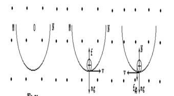 3、计算题 (10分)(创编)如图所示,质量为m、电量为-q的小球,可在半径为R的固定半圆形光滑的绝缘轨道两端点M,N之间来回滚动,磁场磁感强度B垂直于轨道平面,小球在M、N处速度为零。若小球在最低点的最小压力为零,那么磁感强度B为多大?小球对轨道最低点的最大压力为多大?