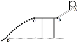 2、计算题 如图所示装置,一个质量为m=2kg的均质圆球放在倾角为θ=37°的光滑斜面上的A点,并被斜面上一个竖直的光滑挡板挡住,处于静止状态,现在,把挡板抽去,圆球将由静止开始下滑,滑到斜坡底部B点后沿水平光滑桌面再滑行一段距离后,以10 m/s的速度水平抛出,落地时的速度方向与水平方向的夹角也为