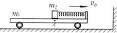 2、简答题 如图所示,在光滑水平地面上,有一质量m1=4.0kg的平板小车,小车的右端有一固定的竖直挡板,挡板上固定一轻质细弹簧.位于小车上A点处质量m2=1.0kg的木块(可视为质点)与弹簧的左端相接触但不连接,此时弹簧与木块间无相互作用力.木块与A点左侧的车面之间的动摩擦因数μ=0.40,木块与A点右侧的车面之间的摩擦可忽略不计.现小车与木块一起以v0=2.0m/s的初速度向右运动,小车将与其右侧的竖直墙壁发生碰撞,已知碰撞时间极短,碰撞后小车以v1=1.0m/s的速度反向弹回,已知重力加速度g取10m/s2,弹簧始终处于弹性限度内.求: