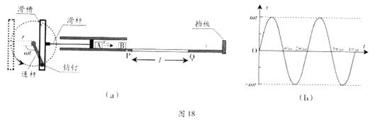 4、计算题 (18分)图18(a)所示的装置中,小物块A、B质量均为m,水平面上PQ段长为l,与物块间的动摩擦因数为μ,其余段光滑。初始时,挡板上的轻质弹簧处于原长;长为r的连杆位于图中虚线位置;A紧靠滑杆(A、B间距大于2r)。随后,连杆以角速度ω匀速转动,带动滑杆作水平运动,滑杆的速度-时间图像如图18(b)所示。A在滑杆推动下运动,并在脱离滑杆后与静止的B发生完全非弹性碰撞。(1)求A脱离滑杆时的速度uo,及A与B碰撞过程的机械能损失ΔE。