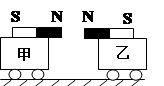 3、填空题 如图所示,将两条完全相同的磁铁(磁性极强)分别固定在质量相等的小车上,水平面光滑,开始时甲车速度大小为3m/s,方向水平向右,乙车速度大小为2m/s,方向水平向左,两车在同一直线上,当乙车的速度为零时,甲车速度为________m/s,方向________。