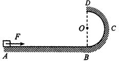 4、简答题  如图,水平地面AB=10.0m。BCD是半径为R=0.9m的光滑半圆轨道,O是圆心,DOB在同一竖直线上。一个质量m=1.0kg的物体静止在A点。现用F=10N的水平恒力作用在物体上,使物体从静止开始做匀加速直线运动。物体与水平地面间的动摩擦因数μ=0.5。当物体运动到B点时撤去F。之后物体沿BCD轨道运动,离开最高点D后落到地上的P点(图中未画出)。G取10m/s2。求: