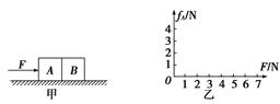 5、计算题 (9分)如图甲所示,完全相同的A、B两物体放在水平面上,与水平面间的动摩擦因数均为μ=0.2,每个物体重G=10 N,设物体A、B与水平面间的最大静摩擦力均为fm=2.5 N,若对A施加一个向右的由零均匀增大到6 N的水平推力F,请将A所