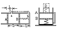 2、简答题 如图所示,一个圆筒形气缸平放在水平面上,A、B为两个可以无摩擦滑动的活塞,B活塞质量为m,A活塞的质量及厚度都可不计。B活塞用一根轻弹簧与气缸底相连,a、b为气缸侧壁上的两个小孔,与外界相通,两小孔及两活塞静止时的位置如左图所示。先用一根细管(细管容积不计)把a、b两孔连通,然后把气缸直立起来,并在A活塞上压一个质量也是m的砝码C,则B活塞下,A活塞下降了