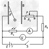 1、选择题  A、B两块正对的金属板竖直放置,在金属板A的内侧表面系一绝缘细线,细线下端系一带电小球(可视为点电荷)。两块金属板接在如图所示的电路中,电路中的R1为光敏电阻(其阻值随所受光照强度的增大而减小),R2为滑动变阻器,R3为定值电阻。当R2的滑片P在中间时闭合电键S,此时电流表和电压表的示数分别为I和U,带电小球静止时绝缘细线与金属板A的夹角为θ。电源电动势E和内阻r一定,下列说法中正确的是?