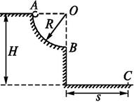 圆弧轨道,半径为R,OB沿竖直方向,上端A距地面高度为H,质量为m的小球从A点释放,最后落在水平地面上C点处。不计空气阻力。已知小球到达B点时对圆弧轨道的压力为3mg,求: