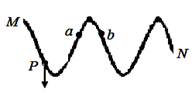 3、选择题 用手握住较长软绳的一端连续上下抖动,形成一列简谐横波。某时刻波形如图,绳上质点P位于其平衡位置下方2cm处,质点a和b正位于各自平衡位置上方2cm处。振幅为4cm。此时,质点P正向下运动,则