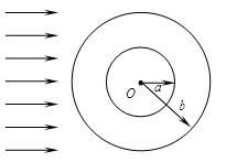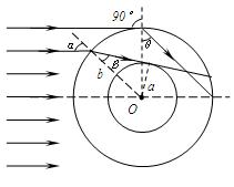的透明物质做成内外半径分别为a=0.10m、b=0.20m的空心球,内表面涂上能完全吸光的物质,不考虑光在介质内部传播时的反射光线。问:当平行光射向此球时有一部分光经过球的折射能从球右侧射出,求这部分平行入射光束的横截面积?