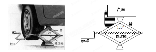 1、选择题 在汽车的维修中,千斤顶发挥了很大作用,图中分别为剪式千斤顶的实物图和示意图。当摇动把手时,螺纹轴迫使千斤顶的两臂靠拢,从而将汽车顶起。当汽车刚被顶起时,若已知汽车对千斤顶的压力为4.0×104N,且千斤顶两臂间的夹角恰为120°,则