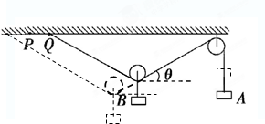 本题解析:根据滑轮不省力的特点可知,整个系统重新平衡后,滑轮两侧的绳子拉力大小F等于物体A的重力不变,B物体对滑轮的拉力也不变;原来整个系统处于静止状态,绳的拉力等于A物体的重力,B物体对滑轮的拉力等于B物体的重力.将绳一端由Q点缓慢地向左移到P点,整个系统重新平衡后,绳的拉力F仍等于A物体的重力,B物体对滑轮的拉力仍等于B物体的重力,都没有变化,即滑轮所受的三个拉力都不变,则根据平衡条件可知,两绳之间的夹角也没有变化,则θ角不变,滑轮将下降,物体A的高度升高,如图所示: