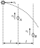 4、选择题 在高处以初速度v1水平抛出一个带刺飞镖,在离开抛出点水平距离l、2l处有A、B两个小气球以速度v2匀速上升,先后被飞镖刺破(认为飞镖质量很大,刺破气球不会改变其平抛运动的轨迹).则下列判断正确的是