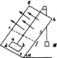 2、计算题 (12分)如图,光滑斜面的倾角α=30°,一个矩形导体线框abcd放在斜面内,ab边水平,长度l1=1m,bc边的长度l2=0.6 m,线框的质量m=1kg,总电阻R=0.1Ω,线框通过细线与质量为m=2kg的重物相连,细线绕过定滑轮,不计定滑轮对细线的摩擦,斜面上水平线ef的右侧有垂直斜面向上的匀强磁场,磁感应强度B=0.5T,如果线框从静止开始运动,进入磁场最初一段时间是匀速的,ef线和斜面最高处gh(gh是水平的)的距离s=11.4m,取g=10m/s2,求