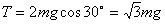 5、计算题 如图所示,质量为m的小球A用细绳悬挂于车顶板的O点,当小车在外力作用下沿倾角为30°的斜面向上做匀加速直线运动时,球A的悬线恰好与竖直方向成30°夹角。求: