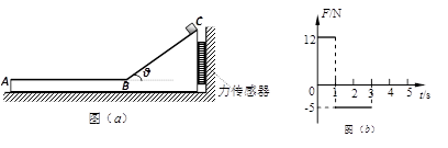 ”型木块放在光滑水平地面上,木块的水平表面AB粗糙,与水平面夹角θ=37°的表面BC光滑。木块右侧与竖直墙壁之间连接着一个力传感器,当力传感器受压时,其示数为正值;当力传感器被拉时,其示数为负值。一个可视为质点的滑块从C点由静止开始下滑,物块在CBA运动过程中,传感器记录到的力和时间的关系如图(b)所示。滑块经过B点时无能量损失。(已知sin37°=0.6,cos37°=0.8,取g=10m/s2。)求: