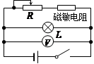3、选择题 已知磁敏电阻在无磁场时电阻很小,有磁场时电阻变大,并且磁场越强阻值越大.为探测磁场的有无,利用磁敏电阻作为传感器设计了如图所示电路.电源的电动势E和内阻r不变,在无磁场时调节变阻器R使小灯泡L正常发光,若探测装置从无磁场区进入强磁场区,则