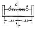 4、计算题 如图所示,在离心机的光滑水平横杆上穿着两个质量分别为2m和m的小球A和B,A、B间用劲度系数为k的轻弹簧连接,弹簧的自然长度为L,当 离心机以角速度ω转动时,欲使A、B两球仍能相对于横杆静止而又不碰到两侧挡板,已知两板间的距离为3L,求转速ω的最大值.