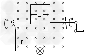 5、选择题 将硬导线中间一段折成不封闭的正方形每边长为L,它在磁感应强度为B、方向向里的匀强磁场中匀速转动,转速为n。导线在a、b两处通过电刷与外电路连接,外电路有额定功率P的小灯泡能正常发光。电路中其余部分电阻不计。则灯泡电阻以及如图位置开始转动90°过程通过灯泡电流方向为