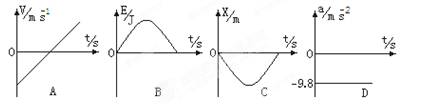 3、选择题 竖直上抛一个小球,从抛出到落回抛出点的过程中,它的速度、重力势能、位移和加速度随时间变化的函数图像(如图所示)中错误的是(不计空气阻力、规定竖直向下为正方向,图中曲线均为抛物线、规定抛出点所在水平面为零势能参考面)